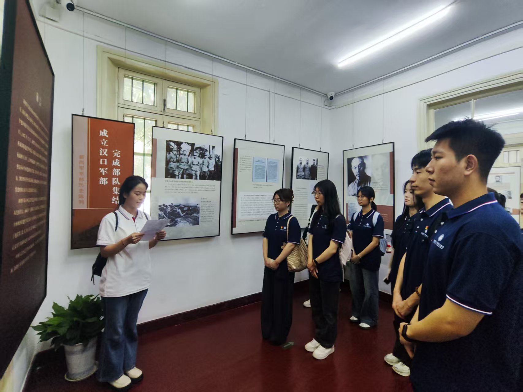 在汉口新四军军部旧址纪念馆,党员曹莹莹同志、成利娟同志为同学们介绍了纪念馆的发展历程与背后承载的抗战故事,叶挺同志在抗战时期的英勇事迹,生动的讲解将大家带回那段烽火连天的岁月,让大家深刻感受到革命先辈为国家独立、民族解放所付出的艰辛努力。