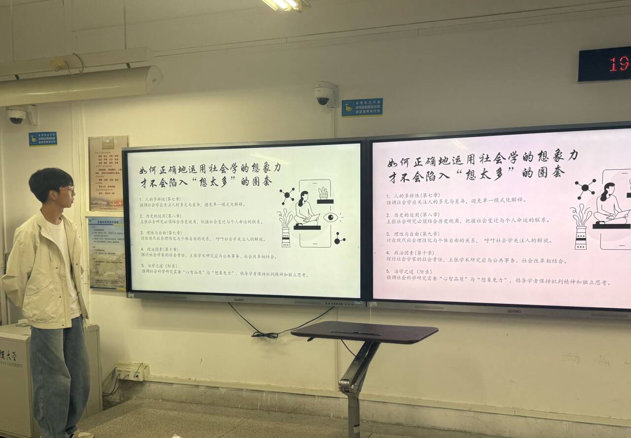 王锦阳同学则从“历史穿透性”“社会关联性”“价值批判性”拆解社会学想象力的内涵,结合社会现象阐释其应用方法,还分享了如何用这种思维解决个人“想太多”的困扰,讲解深入浅出。