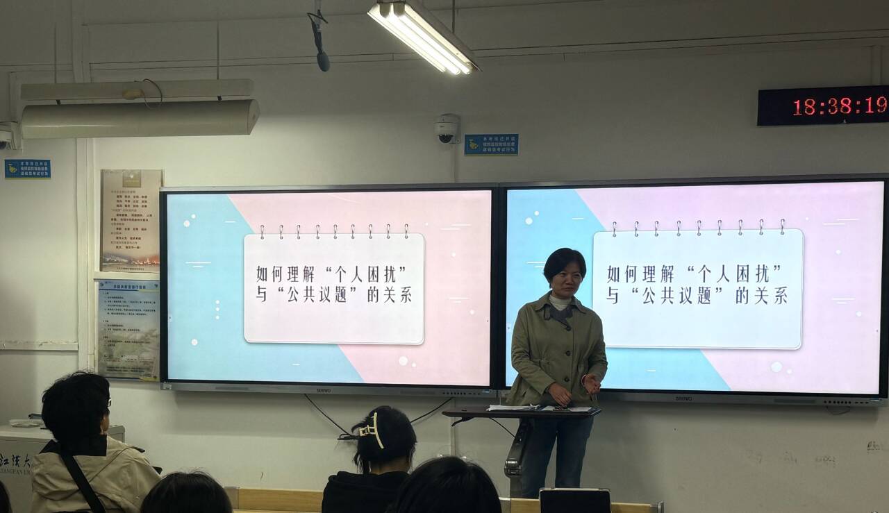 活动伊始,王戈老师以师生共读中集中反映的阅读难题为切入点,结合社工专业特性,细致解析“个人困扰”与“公共议题”的边界。她指出,个体的职业选择、生活困境等看似私人的问题,往往植根于社会结构与时代背景,而社会学的想象力正是连接二者的桥梁。分享中,王老师频频与学生互动,结合校园生活与社会热点抛出问题,引导大家带着书中观点展开思考,探讨如何运用这种“想象力”,让社工服务兼顾个体需求与社会因素,更具深度与温度。
