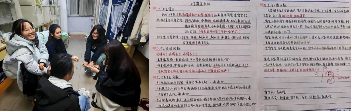 方法落地的关键在寝室内部。学院倡议开展的“寝室夜话”上,各寝室灯火通明,零食与饮料拉近距离。“我有轻微洁癖,希望大家用完卫生间及时清理,我也会多包容大家的小习惯”,3班赵同学的坦诚换来室友们的积极响应;“我打电话太晚影响休息,以后一定去阳台接,保证11点前安静”,孙同学主动致歉的举动让寝室氛围更显温馨。大家分享作息偏好、倾诉学习困扰,回忆一起参加校园运动、共同备考的点滴,隔阂在坦诚中消融,情谊在交流中升温。交流尾声,各寝室定制“个性化寝室公约”,从作息时间到公共物品管理,每一条都凝聚着共识。“这是我们守护‘小家’的约定”,同学们郑重签名,脸上满是期待。