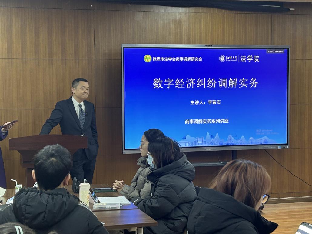(通讯员王兰亭 简冰毳)2026年1月3日,武汉市法学会商事调解研究会携手江汉大学法学院举办“数字经济纠纷调解实务”专题讲座。本次讲座特邀工学博士、高级工程师、汕头仲裁委员会仲裁员李若石先生担任主讲嘉宾,围绕“数据要素市场化背景下的商事调解新路径”向我们展开深度分享。