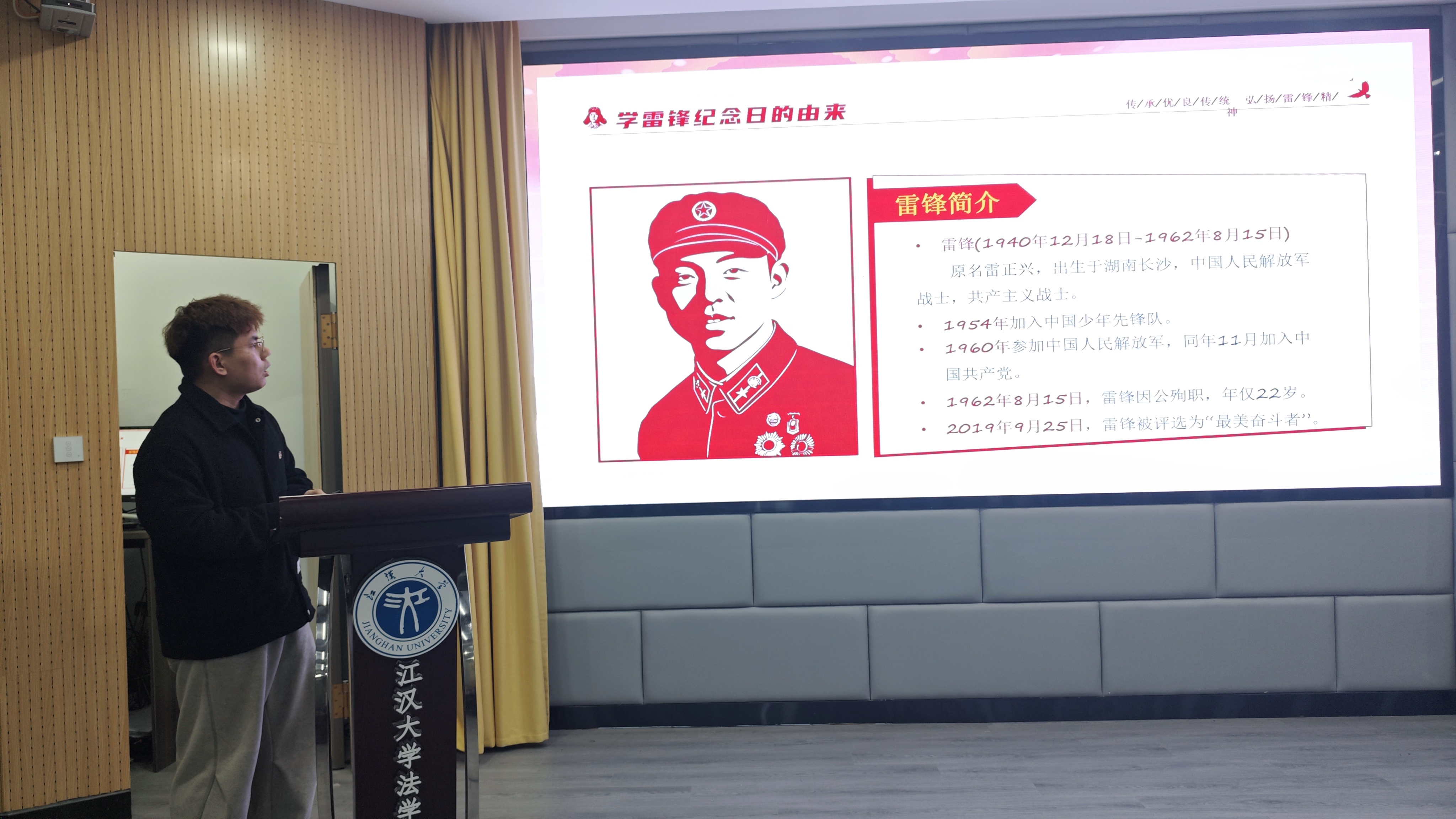 在雷锋事迹分享环节,张晨淇以“一颗钉、一滴水、一团火、一粒种、一分钱”为切入点,生动刻画雷锋爱岗敬业、无私奉献的鲜活形象,号召大家做永不生锈的螺丝钉;陆游带领大家翻开《雷锋日记》,从一段段质朴文字中感受“把有限的生命投入到无限的为人民服务之中去”的信念;倪楠结合姚婕服务工作站、红骑侠等武汉本土榜样,展现江城志愿风采;魏紫珊聚焦榜样力量,号召大家以雷锋为标杆砥砺前行。