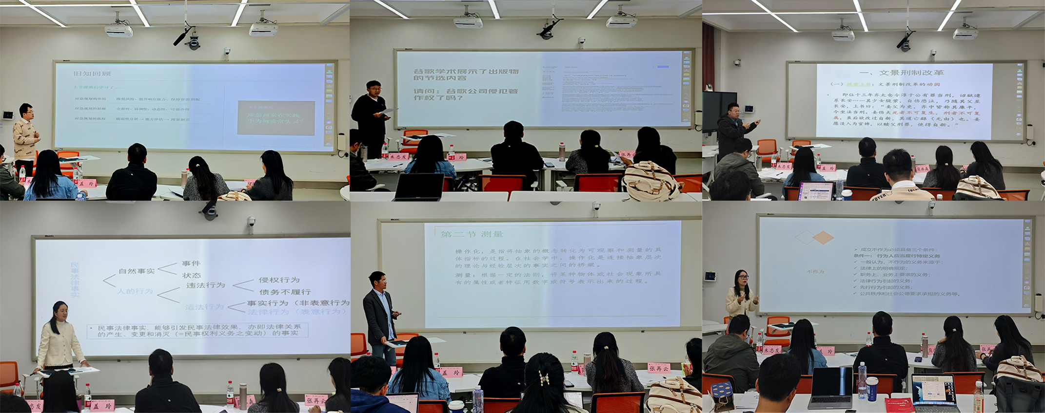 竞赛现场,7位参赛教师各展所长,授课内容紧扣专业特色,将课程思政、实务案例与前沿热点有机融入课堂教学。刘浩然老师梳理民事法律事实体系,在严密逻辑中培养学生的法治思维;白雪老师剖析不作为犯罪成立条件,引导学生思考法律底线与社会道义的统一;郑进老师讲解社会研究的测量与操作化方法,强调求真务实的科研品格;刘舟祺老师以“缇萦上书”为引,阐释文景刑制改革,挖掘传统法律文化中的人文精神;张心怡老师以武汉新就业群体案例为切入点,在社会工作服务讲解中厚植民生情怀;岳靖凯老师围绕公共危机应对展开讲授,在案例讨论中强化社会治理的责任担当;王墨竹老师通过对《著作权法》合理使用制度的分析,引导学生树立公平正义的法治价值观。